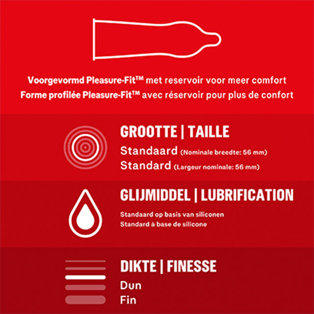 Slechts 0,055 mm dik en toch ongelooflijk sterk, dit is het condoom van de volgende generatie dat maximale intimiteit en ultieme veiligheid biedt. Geschikt voor diegenen die een ruime pasvorm nodig hebben, aangezien deze condooms een nominale breedte van 56 mm hebben.