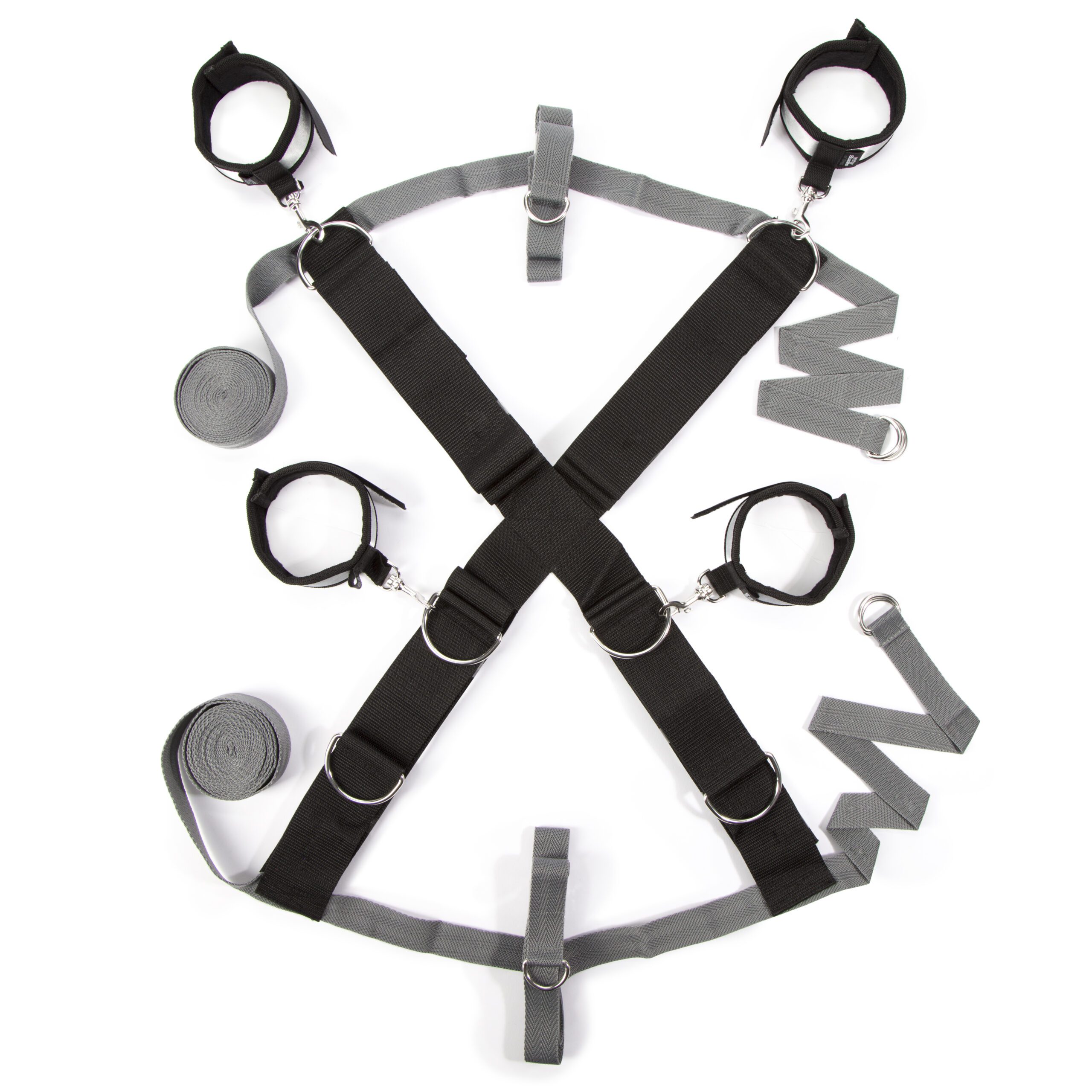 De restraint is eenvoudig te installeren en vereist geen gereedschap voor montage en kan bij een tweepersoonsbed van elke omvang. Plaats de zwarte bandjes in een diagonaal kruis op het matras met de pols en enkelboeien op elke hoek. Leg de dunne grijze bandjes rond het hoofd en de voet van je matras, zorg dat de 2 D-ringen aan de bovenkant blijven. Breng de riemen door de D-ringen en draai.