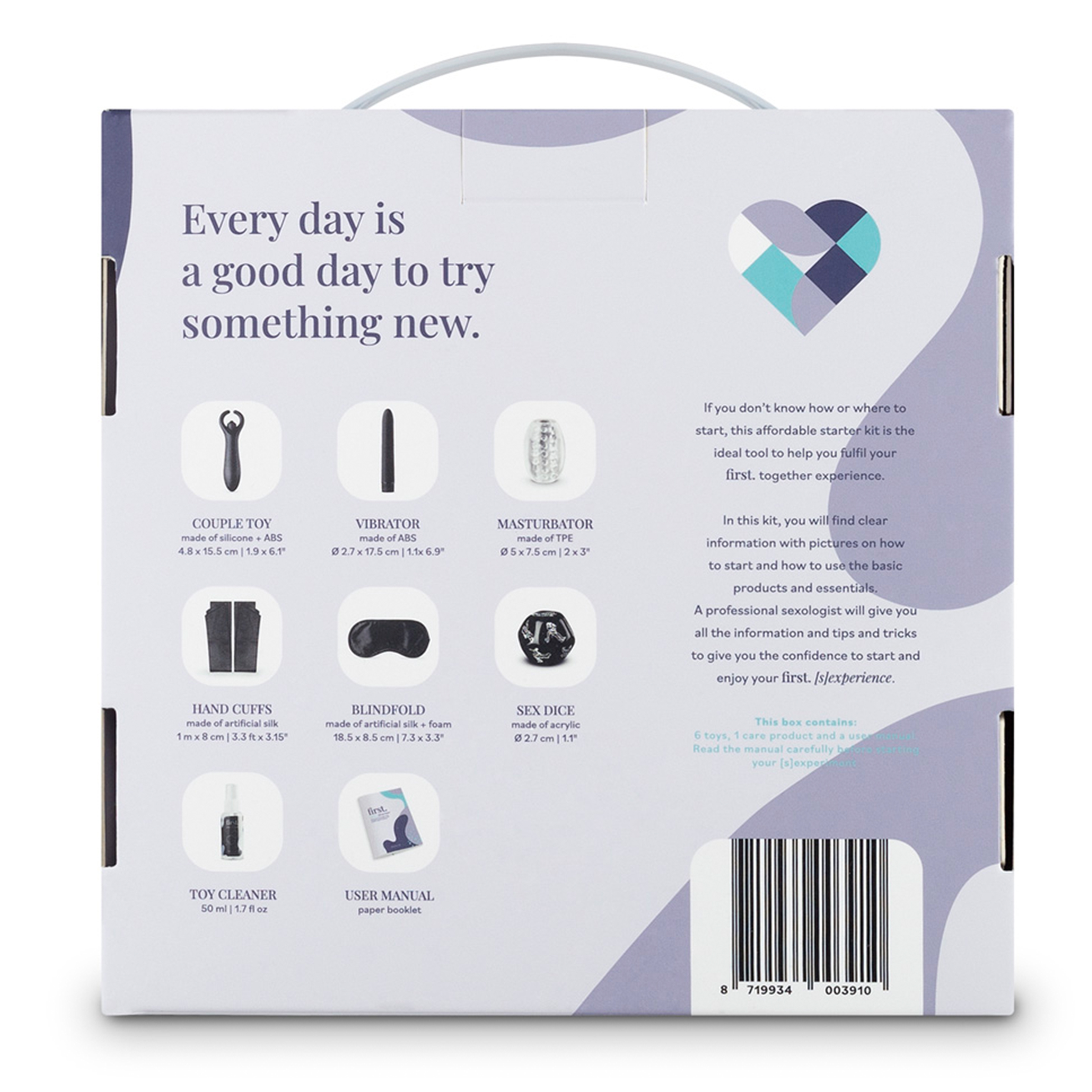 De First. Together [S]Experience Starter Set is de perfecte starters-kit voor stellen die nieuwsgierig zijn naar het gebruik van seksspeeltjes, maar weinig tot geen ervaring hebben. Deze box heeft een verrassende, complete inhoud voor vele spannende avonden in de slaapkamer. Het mooie design maakt dit een perfecte box om cadeau te geven of te krijgen. Dit pakket bevat veel speelgoed om elkaar mee te plagen en te plezieren. Deze box voor koppels is geschikt voor beide partners en kan worden gebruikt voor vaginale, clitoris- of penisstimulatie. De bullet vibrator beschikt over 10 verschillende vibratiestanden en een uitneembare bullet vibrator. Natuurlijk is de masturbator is speciaal ontworpen voor een fijne penismassage. De flexibele mouw is voorzien van stimulerende ribbels en studs. Gebruik de vibrator om elkaars gevoelige plekjes te verkennen. Je kunt de trillingsintensiteit langzaam verhogen met een continue controle. Al het speelgoed is gemaakt van lichaamsveilig materiaal en is gebruiksvriendelijk. Maak het nog spannender met de blinddoek en de satijnen manchetten of laat de dobbelstenen beslissen wat je volgende positie wordt. Ook makkelijk: deze set bevat ook een handige fles speelgoedreiniger en een uitgebreide en eerlijk geschreven handleiding (in het Engels), vol met uitleg, do’s en don’ts en geeft je voldoende zelfvertrouwen om aan deze nieuwe reis te beginnen.